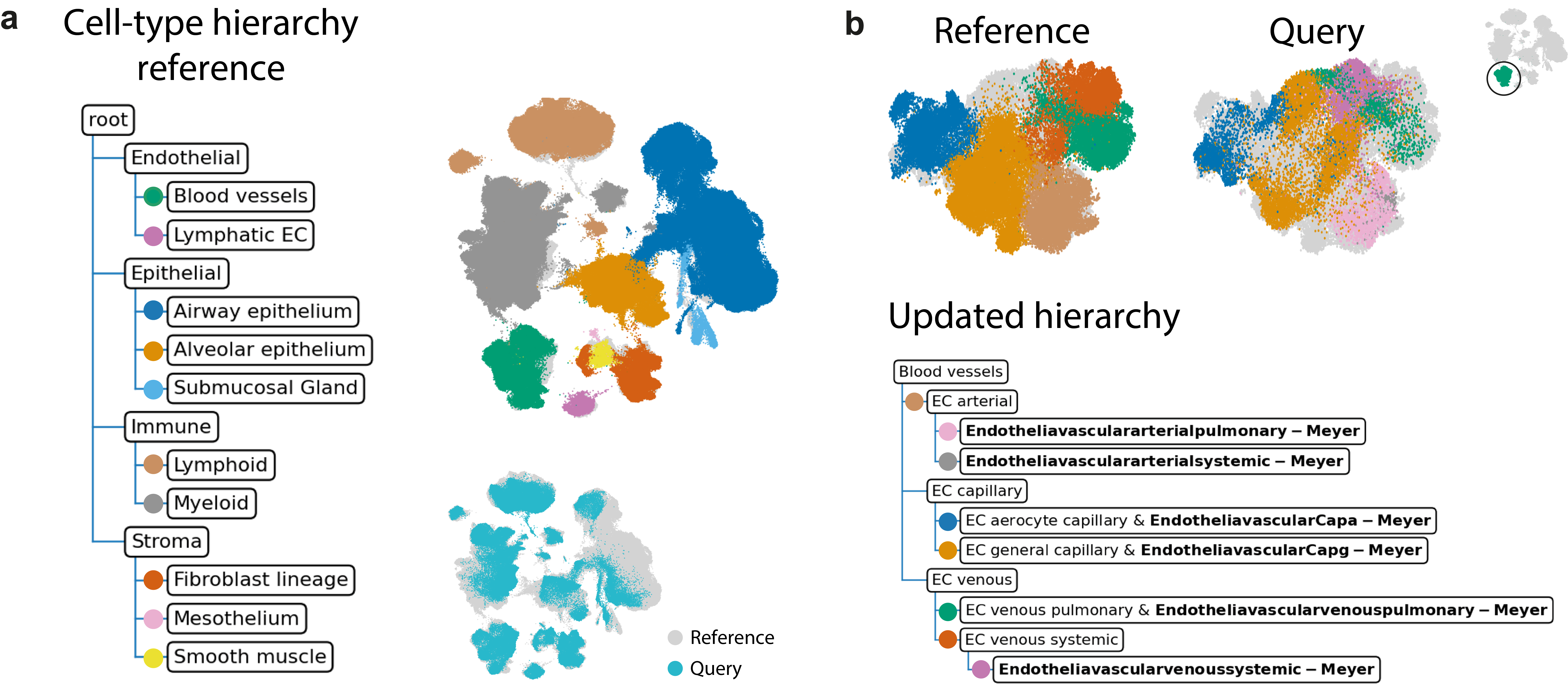 In order to develop such atlas, Michielsen et al. had to take into account two major challenges. First, identifying relationships between cell types across datasets is challenging. How does a cell type from study A match a cell type from study B? These identities are assigned by different researchers and the process is very subjective. Even more problematic is the fact that there is no universal convention on cellular hierarchy. For example, while one study can label cells as neurons, another differentiates between excitatory and inhibitory neurons, which in fact is a sub-compartment of the former. Second, as more single-cell data becomes available, this atlas needs to be updated which renders previous analysis using an older version of the atlas obsolete. Ideally, a new dataset would be projected on the existing atlas, such that the atlas can be updated progressively instead of remade from scratch. To overcome these challenges, treeArches combines two existing methods: scHPL and scArches. scHPL tackles the first challenge of matching the cell types across datasets and automatically builds a cell-type hierarchy. Using scArches, new datasets can be projected on top of the reference atlas such that the atlas and the corresponding hierarchy can be updated. If the cells in the new datasets are unlabeled, the current atlas can also be used to automatically annotate the cells. In the paper, they apply treeArches amongst others to the Human Lung Cell Atlas, a reference atlas that consists of 16 lung datasets with a well-defined cell-type hierarchy. They have chosen this example as a proof-of-concept because of the high quality annotations of this atlas. When projecting new datasets on this atlas, the authors show that they can either increase the resolution of the hierarchy when these datasets are labeled, or can annotate the cells if the dataset is unlabeled. They could also detect diseased cell types in an idiopathic pulmonary fibrosis dataset.